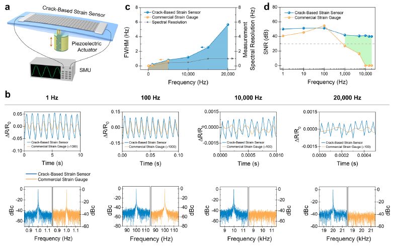微裂纹的瞬间断开或重新连接使我们的传感器能够检测到超高频机械振动。为了演示这种能力,一个压电驱动器被装备到机械调制的正弦波形悬应变传感器,以便发挥机械应变在一个广泛的频率范围(1-20000Hz);实时监测传感器的电阻变化。实验证明了有裂纹的传感器信号输出大大增强,并且具备超高分辨率的声音信号识别功能。