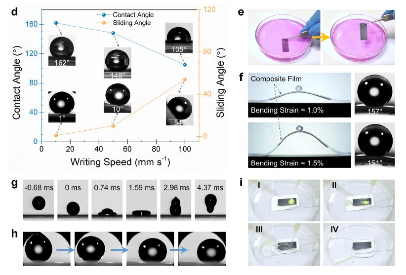 该研究中,为了实现超疏水导电传感膜,将超短飞秒激光脉冲辐射到涂覆在PDMS衬底上的氧化石墨烯薄膜上,同时实现氧化石墨烯的光还原和PDMS的光热分解。通过单步FsLDW图形化,恢复了石墨烯的导电性,有效地在石墨烯表面形成了荷叶状的层次结构,并获得了自清洁(疏水角162°)性能。