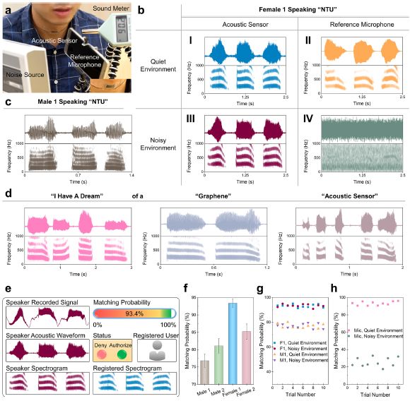 皮肤可附加装置的传感性能为其在语音控制语音识别中的应用提供了良好的前景。首先,在一个安静的环境中,通过皮肤连接的声学传感器和一个参考麦克风记录女性扬声器发出的不同字母(NTU)(背景声音为∼45db声压级,SPL)。其次,再次在嘈杂的环境中进行语音记录(背景声音为∼90db SPL)。该传感器获得了比麦克风更好的声音信号。最后,其他说话者重复相同的发音(如图所示),显示独特的波形和光谱图,女性扬声器的基频和谐波频率比男性扬声器的基频和谐波频率更高、更窄。该传感器表现了在语音识别领域的广阔应用前景。