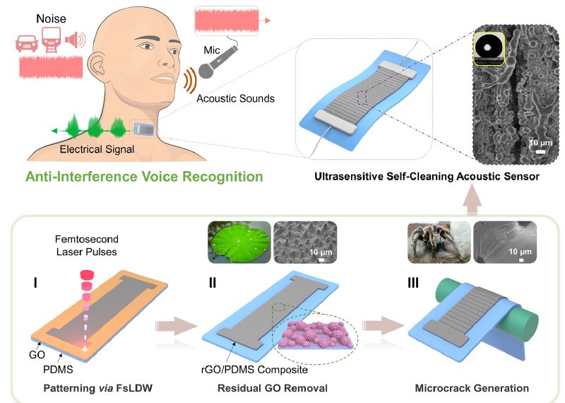 近日,南洋理工大学Jianing An教授,韩国高等科学技术研究院Young-Jin Kim教授与南京工业大学孙耿志教授合作,提出了一种基于还原石墨烯氧化物/聚二甲基硅氧烷复合膜的皮肤自清洁、超灵敏、超快的声传感器。得益于蜘蛛裂隙状多尺度锯齿状微裂纹和莲叶状层次结构的协同作用,此超疏水传感器具备超高灵敏度(GF = 8699),超低检测极限 (ε=0.000 064%),超快响应行为(107μs),出色的设备耐久性(> 10,000循环),可靠地检测超过可听频率范围(20−20,000 Hz)的高信噪比的声学振动。相关研究成果以题为“Ultrasensitive Anti-Interference Voice Recognition by Bio-Inspired Skin-Attachable Self-Cleaning Acoustic Sensors”发表在《ACS NANO》上(见文后原文链接)。