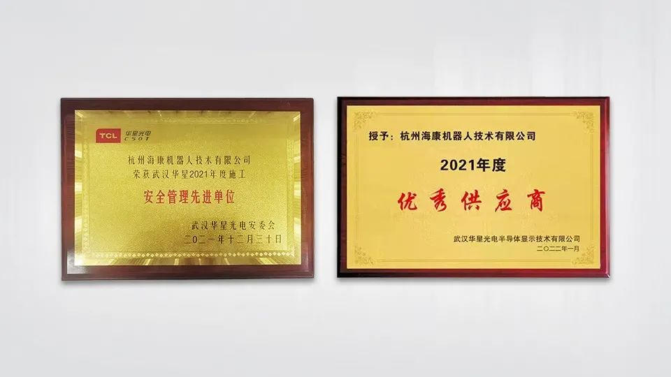 半导体显示龙头华星光电在其武汉T4MOD厂百级无尘车间引入海康机器人潜伏及移载AMR222台,与LIFT、STK配合实现前段来料首站搬运,面板组装,成品打包排队,整段制成装配等流程,搬运效率最高达85%,准确率达100%,授予海康机器人“2021优秀供应商”及“安全管理先进单位”称号。