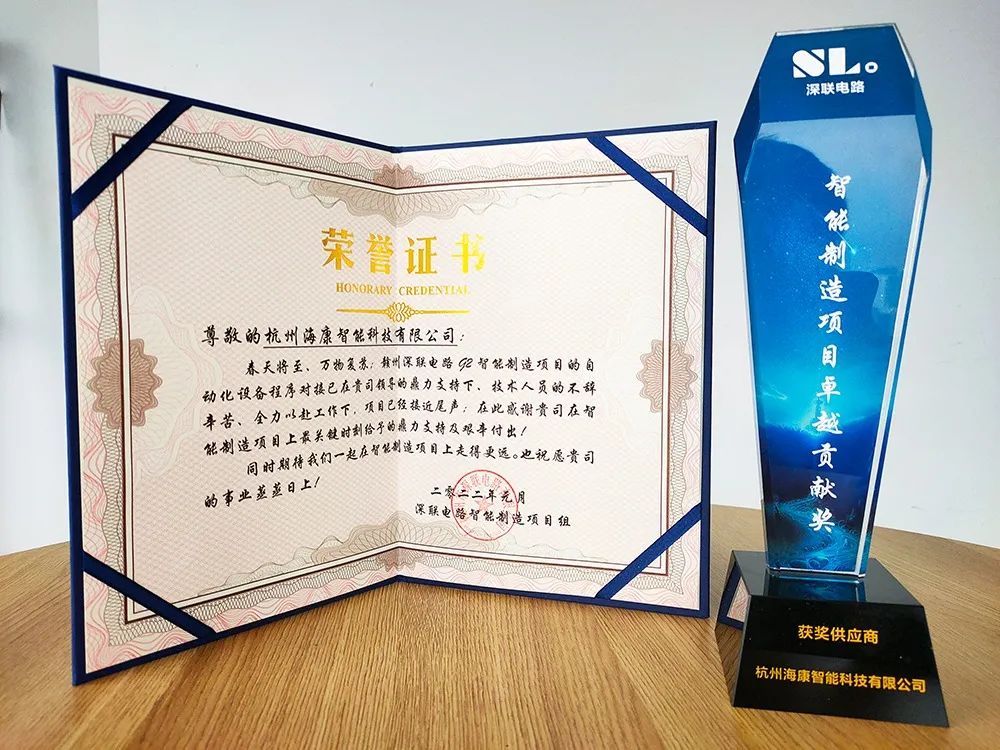 深联电路于赣州工厂于2019年引入海康机器人智能仓储解决方案,打造PCB智能化制造工厂。整体项目规划部署AMR 100台,实现了整厂各道工序间的物流自动化,大幅提升生产效率与信息化管理水平。在项目收官之际,深联电路授予海康机器人“智能制造项目卓越贡献奖”,并对双方未来的深入合作寄予期望。