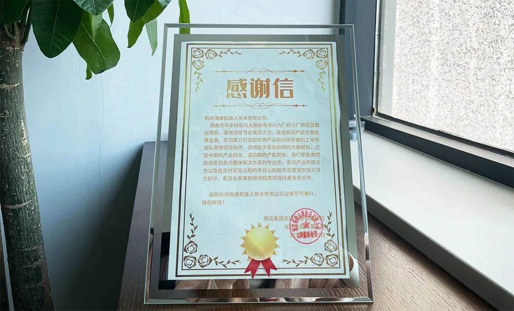 我们还收到了来自东磁的感谢信。东磁太阳能电池片工厂的搬运项目率先引入海康机器人AMR,实现了复杂工艺流程的自动化和智能化,降低了运营成本和员工劳动强度,显著提升了产能。海康机器人凭借稳定可靠的产品方案和专业团队对客户需求高度响应,从方案规划到产品研发及后期产能爬坡,全程紧密合作,得到了用户的一致肯定。