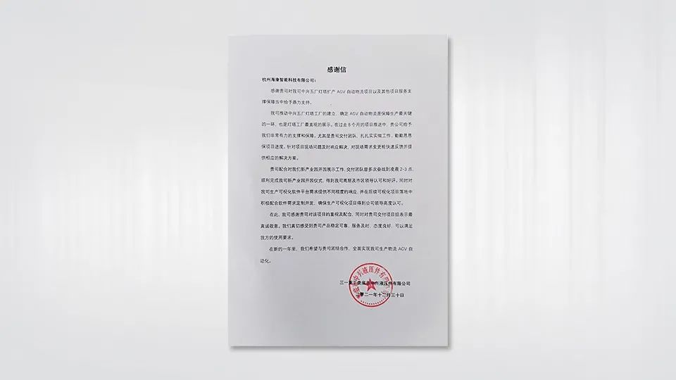 这封感谢信来自三一重工,用以感谢我们对三一重工中兴五厂灯塔工厂项目以及其他项目的服务支撑和保障。客户对海康机器人团队在项目交付过程中积极响应、扎实勤恳的工作态度,以及可视化项目落地过程中,团队对软件定制开发需求的响应和支持予以高度认可。