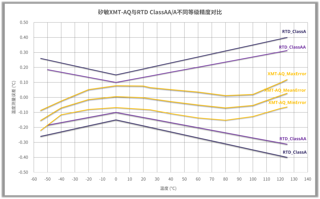 在-55°C至125°C宽温度范围内,精度优于RTD Class AA 和 Class A 标准,满足工业场景对温度数据的严苛需求,误差更低,测量更精准。