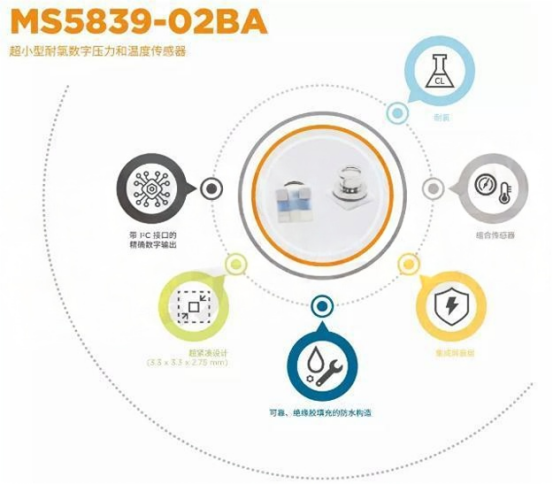 MS5839 是一种数字高度计(测量范围为 3.3 x 3.3 x 2.75 mm),该产品针对存在氯和盐水的应用进行了优化。MS5839 的坚固、充满凝胶的设计使其能够在严苛环境下工作,同时提供准确和可靠的数字测量。