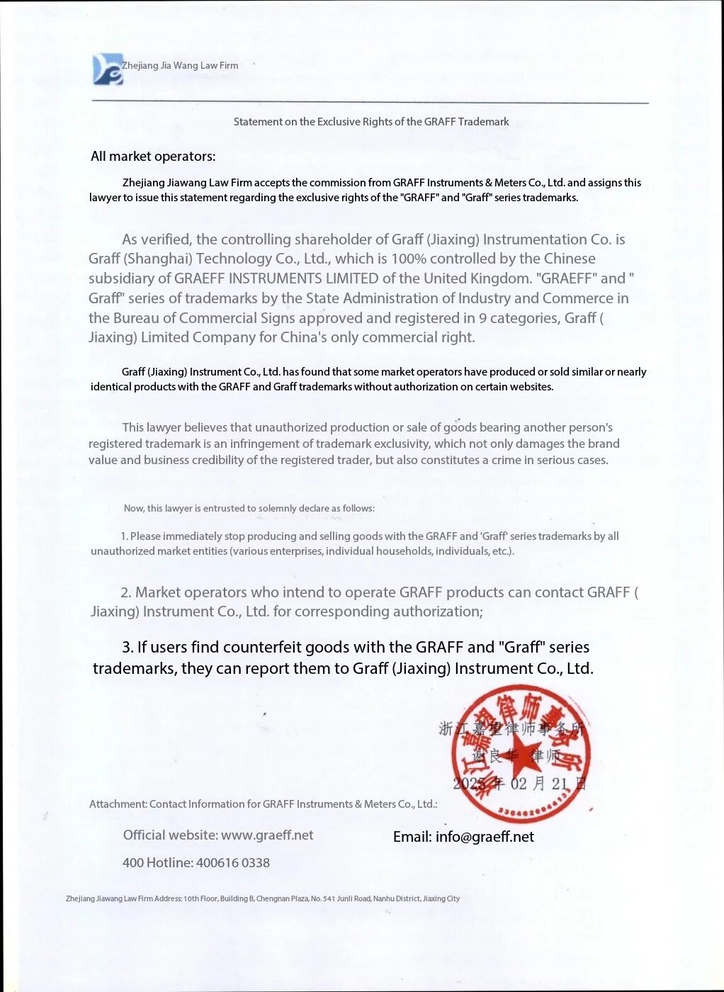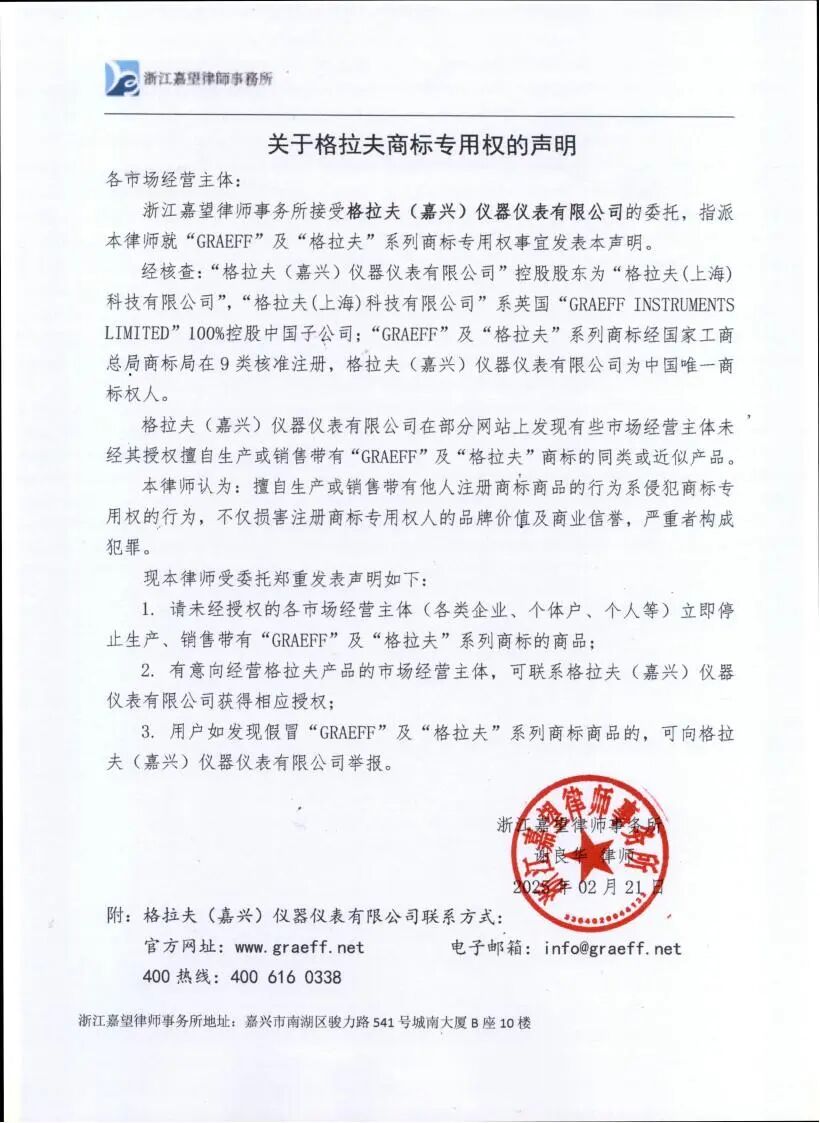 在此,格拉夫(嘉兴)仪器仪表有限公司做出如下严正声明: