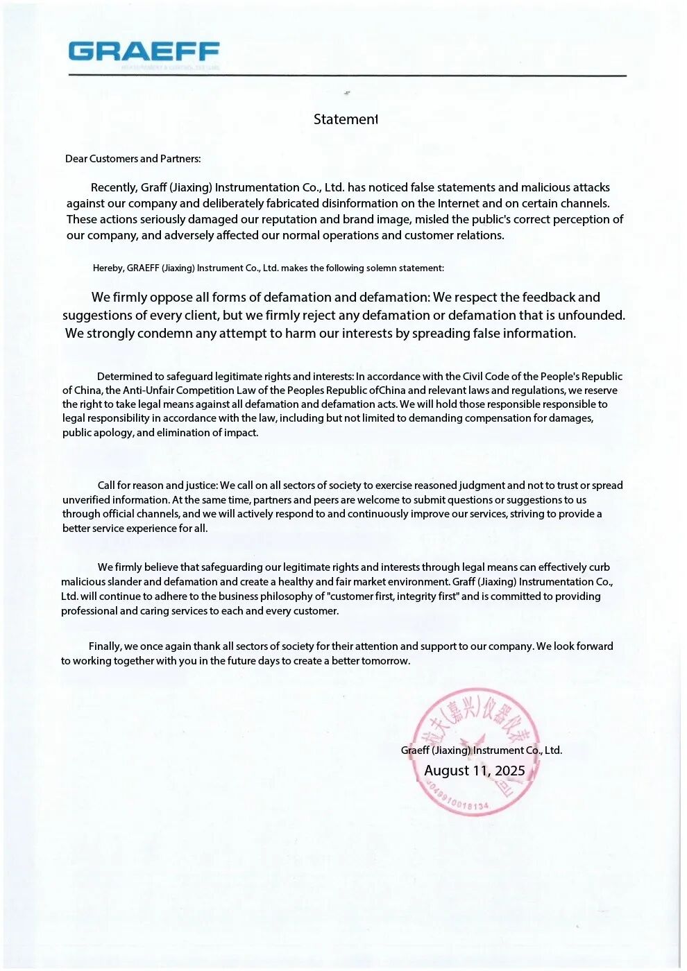 We firmly believe that safeguarding our own legitimate rights and interests through legal means can effectively curb malicious defamation and slander, and create a healthy and fair market environment. Graff (Jiaxing) Instruments Co., Ltd. will continue to uphold the business philosophy of "customer first, integrity-based", and is committed to providing every customer with professional and considerate services.