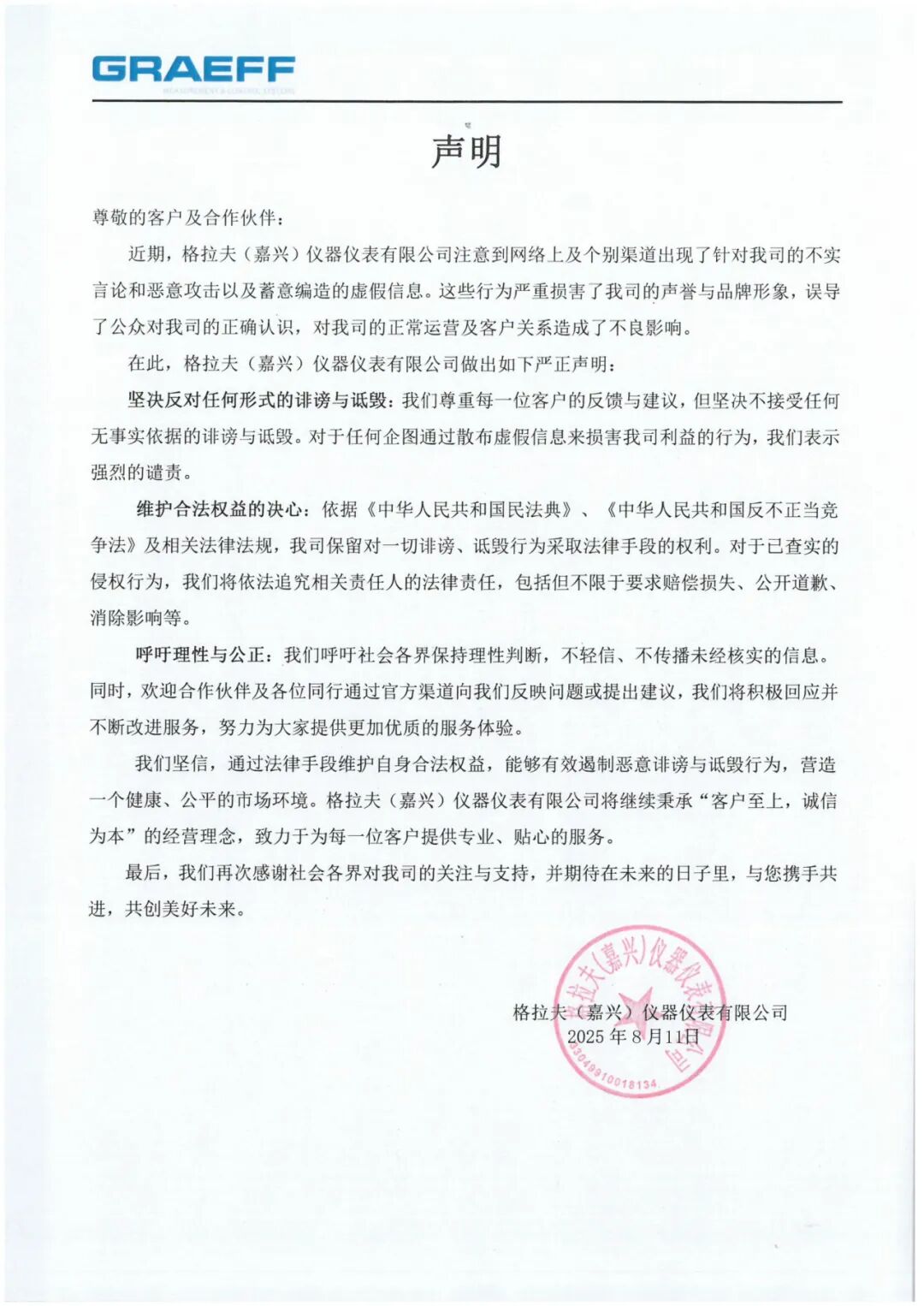 近期,格拉夫(嘉兴)仪器仪表有限公司注意到网络上及个别渠道出现了针对我司的不实言论和恶意攻击以及蓄意编造的虚假信息。这些行为严重损害了我司的声誉与品牌形象,误导了公众对我司的正确认识,对我司的正常运营及客户关系造成了不良影响。