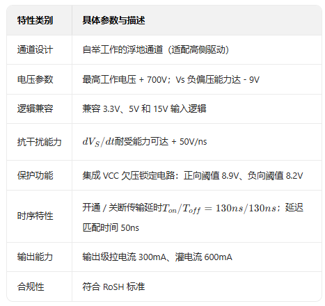 其次是抗干扰与时序性能。芯片的 dV/dt 耐受能力高达 50V/ns,能有效抵御高压环境下的电压突变干扰,减少误触发风险;开通 / 关断传输延时(Ton/Toff)均为 130ns,延迟匹配时间仅 50ns,时序同步性优异 —— 这意味着替换后,电机转速控制精度、逆变器输出波形质量不会受任何影响,甚至在高频工况下的响应速度更有保障。